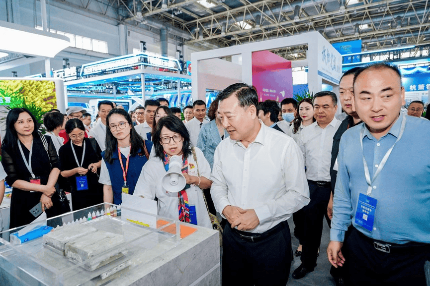 姜萬榮副部長參觀澎內(nèi)傳展臺,邊聽講解、邊認(rèn)真觀看水池池壁裂縫自愈合實(shí)際應(yīng)用效果。